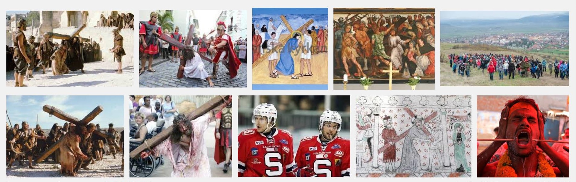 Med anledning av den stundande påskhelgen bildgooglade jag ”golgatavandringen” på min dator.  I raden av foton från religiösa skådespel och målningar där Jesus släpar sitt kors längs Via Dolorosa dök ett par till synes främmande fåglar upp: Två spelare från Södertälje Sportklubb.